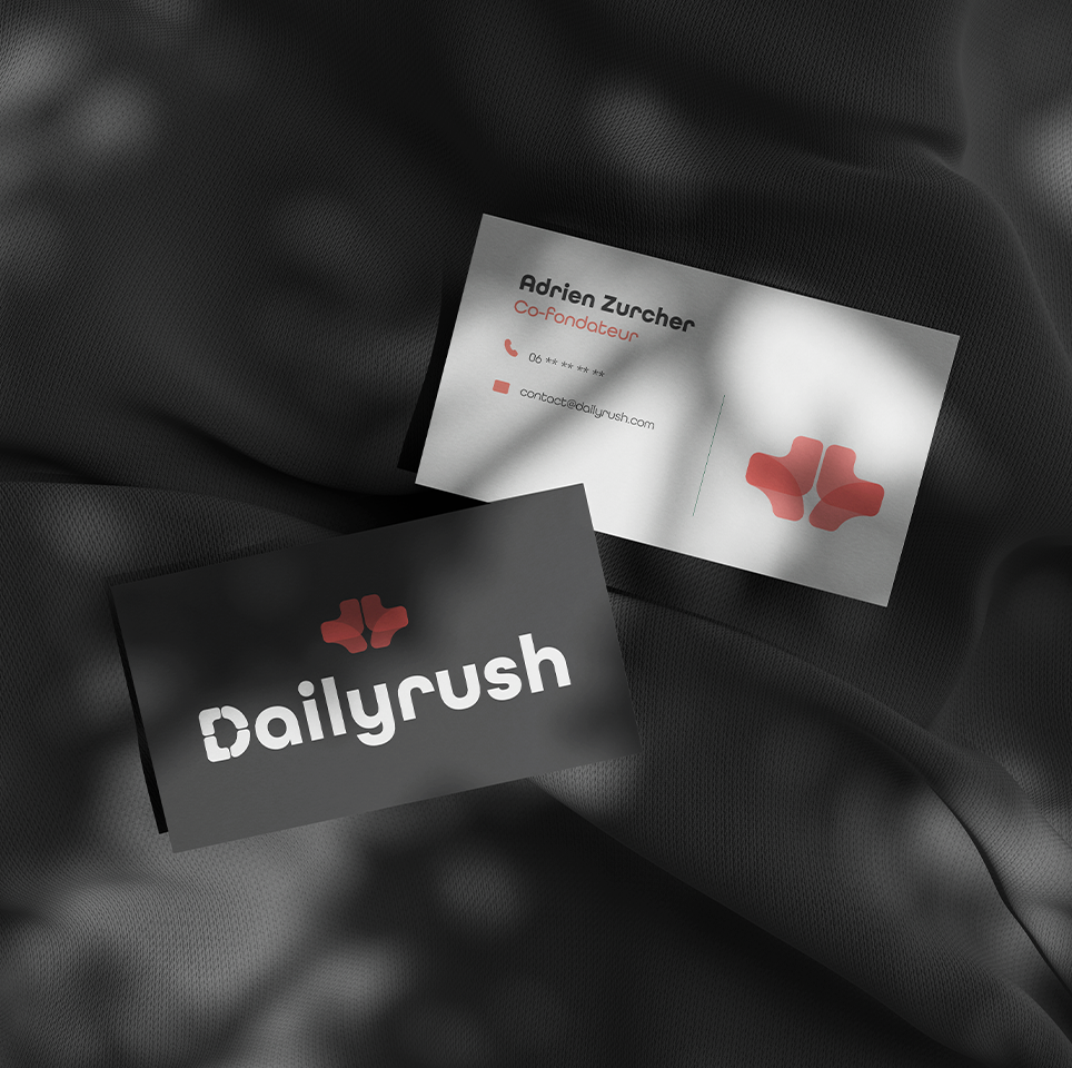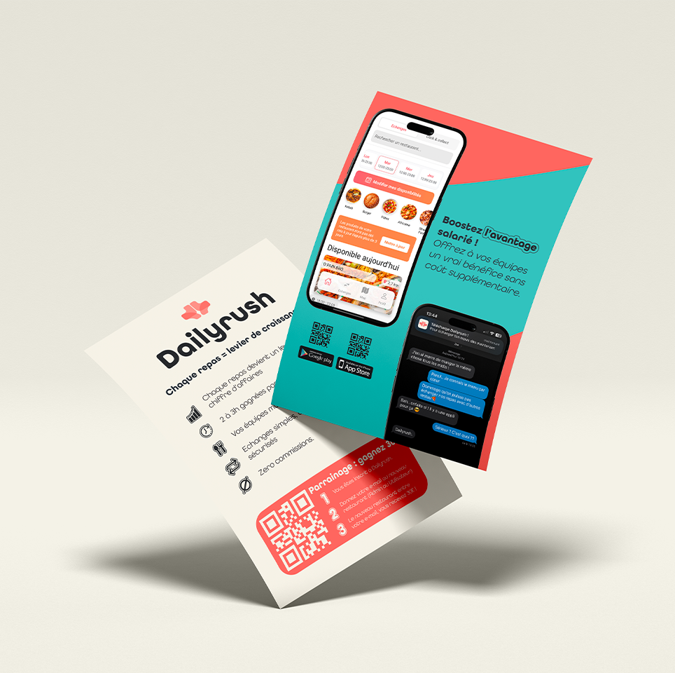 DailyRush est une identité visuelle conçue pour une application dédiée aux professionnels de la restauration, permettant d’échanger les repas entre restaurants et de créer un véritable avantage salarié pour les équipes.